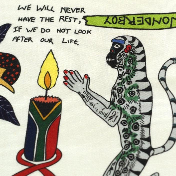 Inspired by Wonderboy’s romanticism, this design draws on elements from his iconic artworks, particularly the Love Story and Days of Lives ceramic plates. Inscribed with evocative poetry, these works are reimagined on fabric, bringing their thought-provoking beauty into the home. The result is a design that infuses any space with love, poetry, and romance.